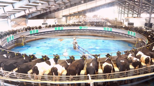 奶牛在重型轉(zhuǎn)盤擠奶機(jī)上擠奶。本報(bào)融媒體記者 邢棟 攝